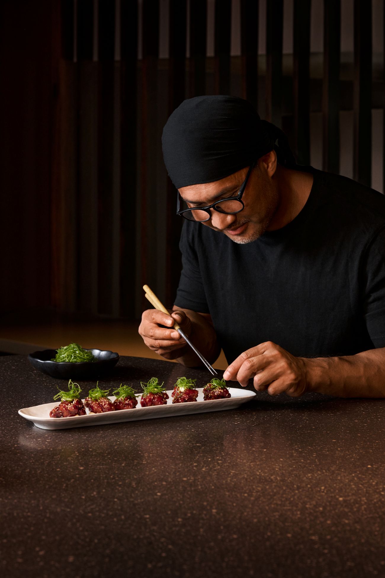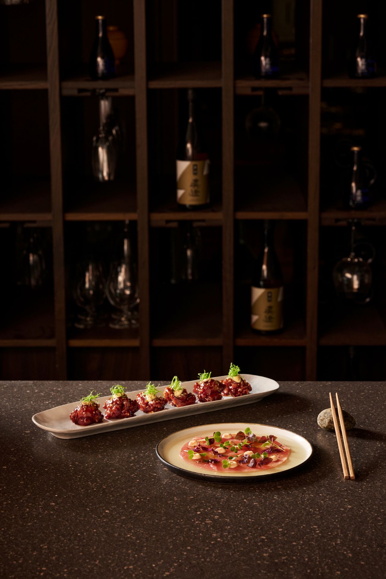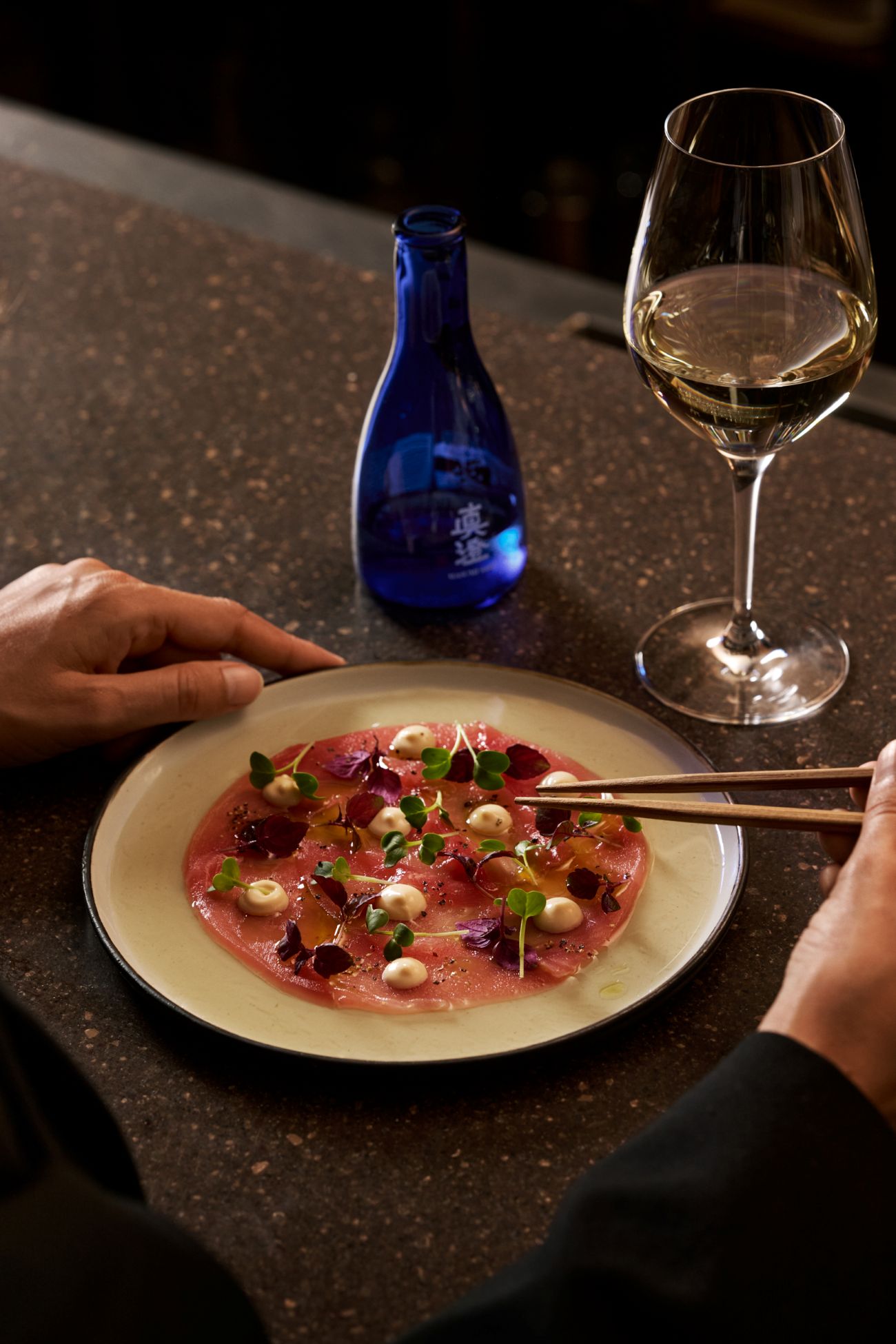 Yellowfin tun med lys ponzu på hvid soya og yuzu, miso-parmesan-aioli, ekstra jomfruolivenolie samt shiso og daikon skud. Frisk, balanceret og med masser af dybde.