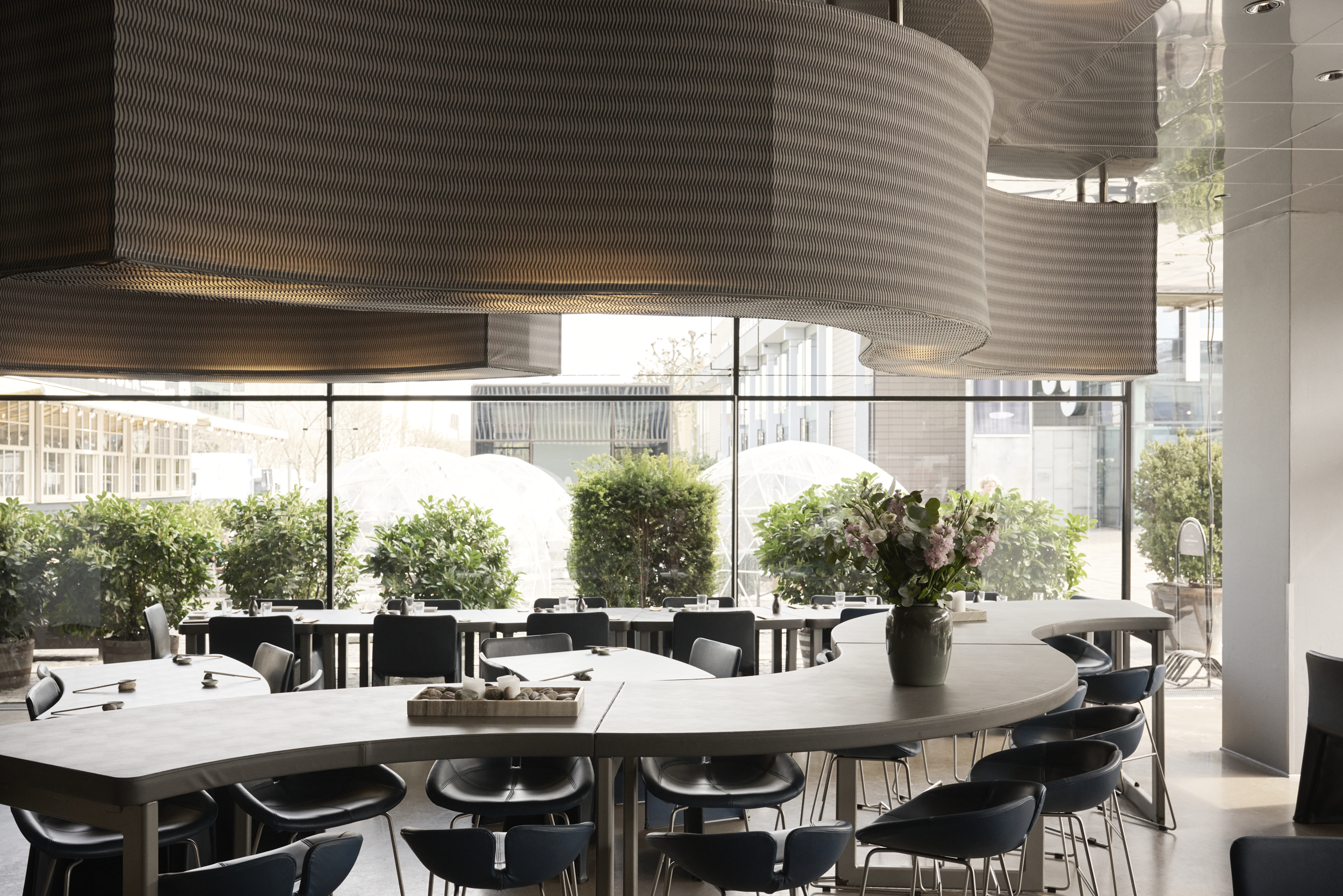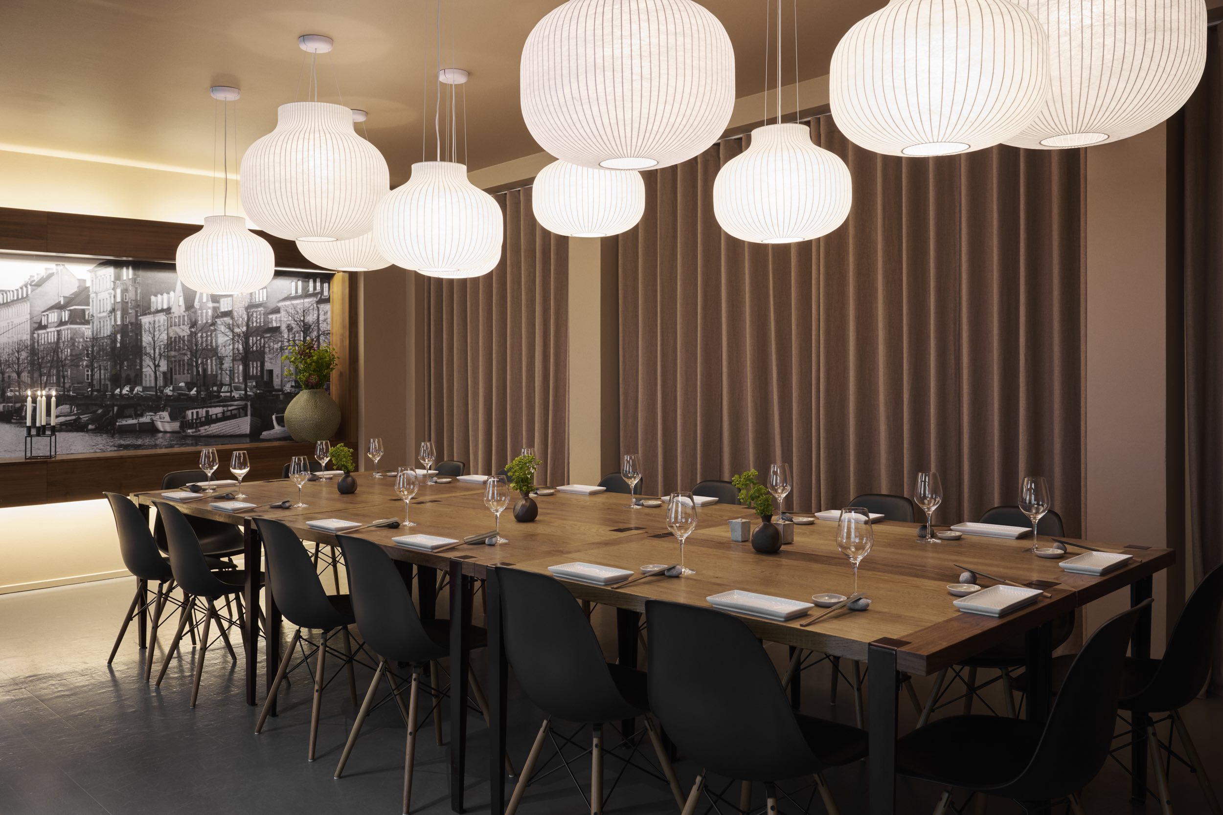 Our restaurant in Lyngby is large and bright beneath the light of the lamps.