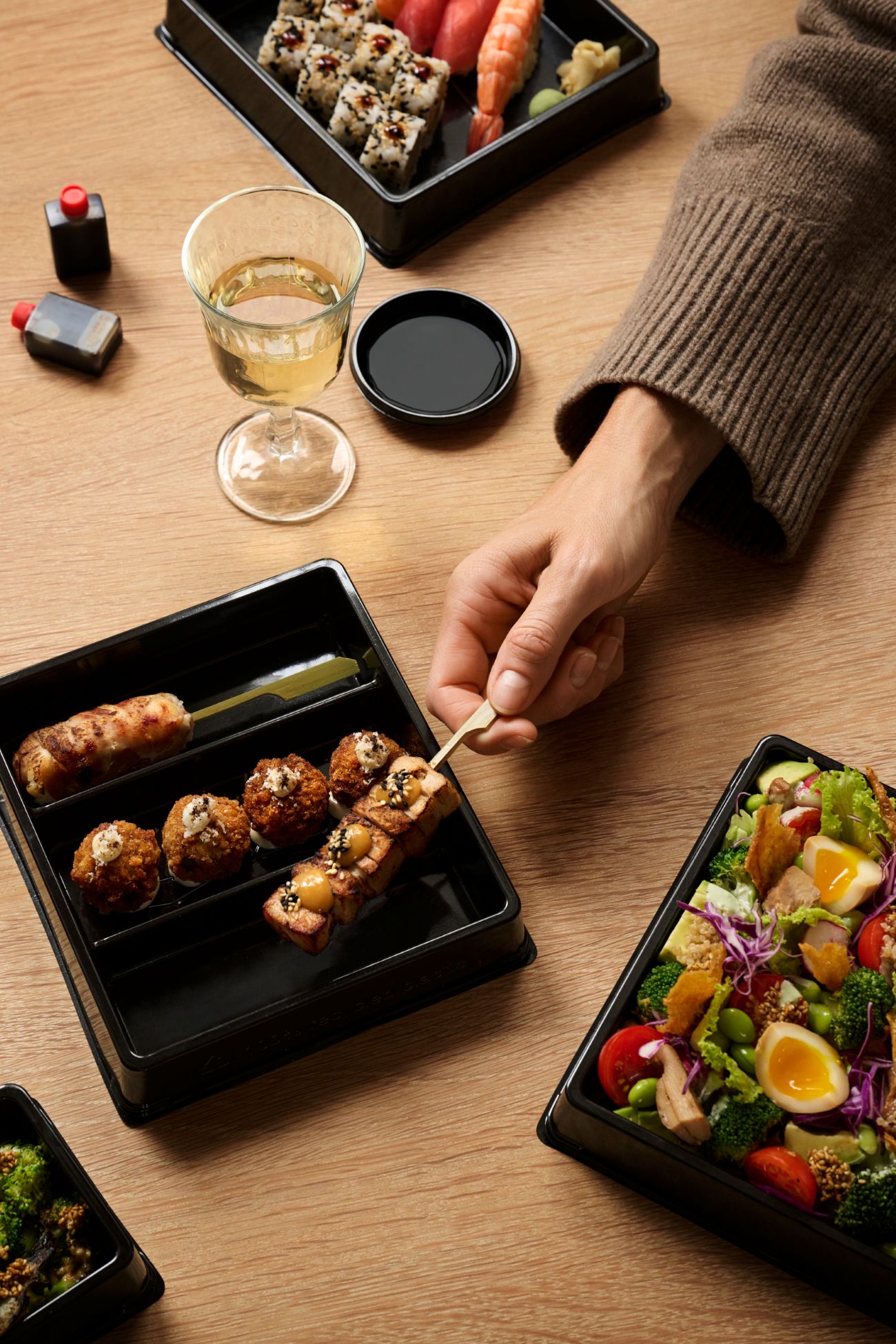 Imagine a weekend evening with rain tapping against the window and a blanket pulled close. You light a candle, sink into the sofa – and enjoy freshly made sushi and grilled sticks at home. Or a midweek dinner with family, where everyone chooses their favourites and the meal becomes the moment that gathers you. Our takeaway also makes the perfect companion for a film night with friends – or for the evenings when cooking feels like too much, but you still want something special without the effort.